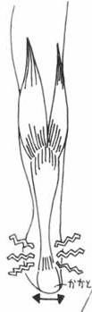足を着くたびにかかとの骨がぐらぐら揺れることで、かかとの筋肉の付着部は、一定方向に引っ張ら