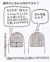 この横溝は、爪の発育が悪くなったためにできたものです。だから、爪の横溝から、どれくらい前に病気をしたか推測することができます。爪が伸びるのは、一日に0.1ミリほどです。栄養障害や精神的なショック、あるいは湿疹、皮膚炎などの皮膚の病気でも、横溝ができます。