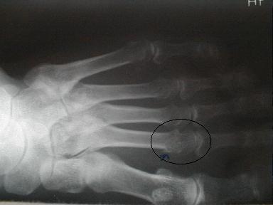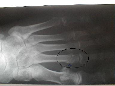 受傷時8月6日のx-pでは骨折が確認出来ずに他の医院で打撲として治療していたもので、再度x-pを撮ったところ骨折が確認できた固定をしなかった為に骨に無理な力が加わったものと思われる。固定の重要性が認識される。