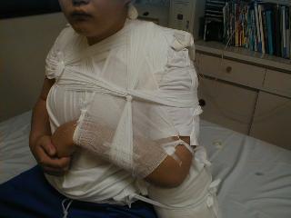 保存的治療か観血的治療が最良か迷いましたが、本人、家族の希望もあり保存的治療を試みました。 当初、患者の体型(満型で猫背)や筋力により全く中枢骨折片と末梢骨片が寄らず苦労しました。 今回、このような骨折を経験して固定による持続的な整復法と安静固定の困難と重要性を痛感しました。 |